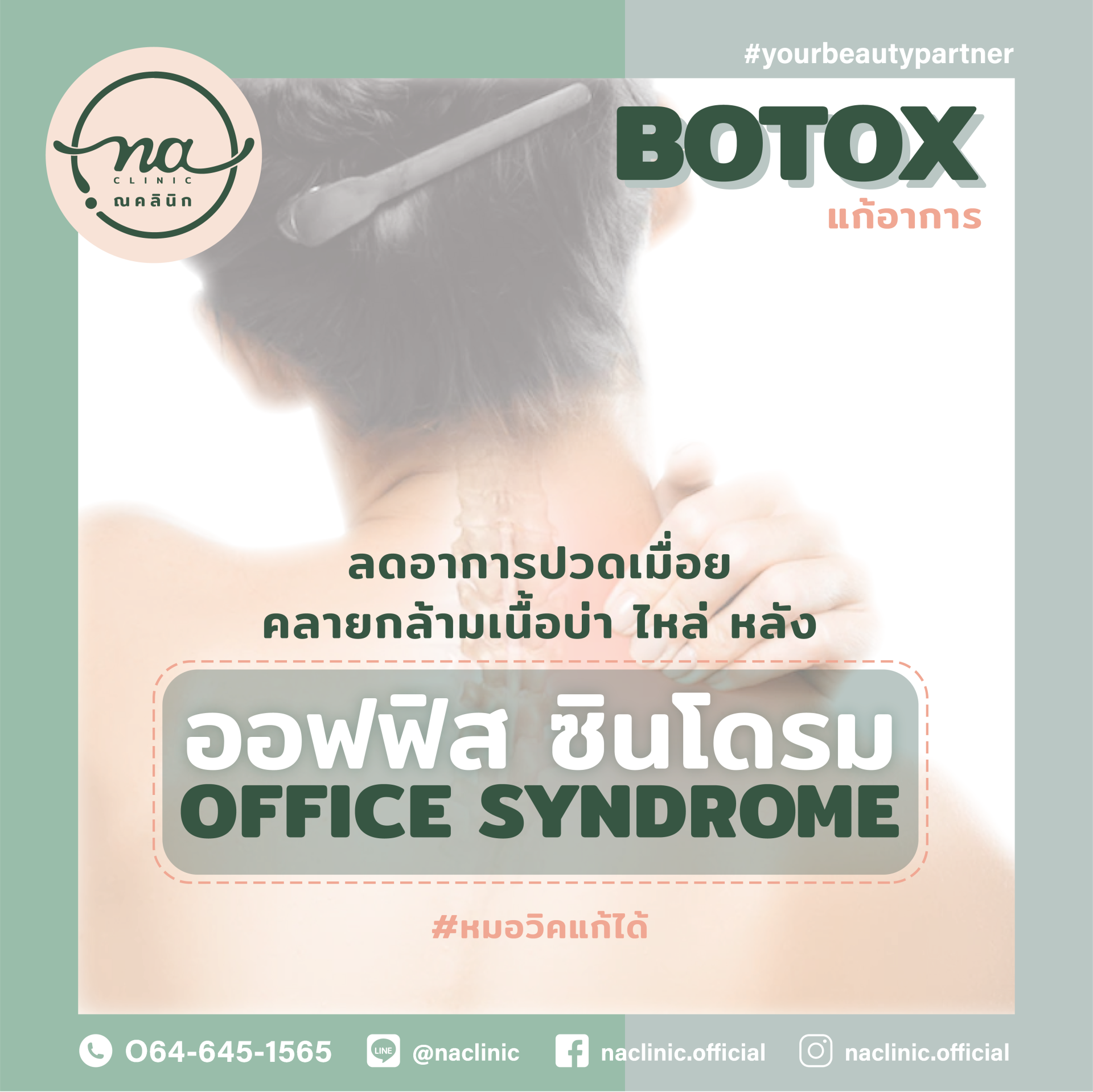การฉีดโบท็อกซ์ (Botox) สามารถแก้ปัญหาออฟฟิศซินโดรม แก้อาการปวดเมื่อยให้หายได้ เนื่องจาก สาร Botulinum Toxin A เป็นโปรตีนบริสุทธิ์ สกัดมาจากแบคทีเรียที่มีประโยชน์ เมื่อฉีดเข้าไป สารโบท็อกซ์จะทำให้กล้ามเนื้อที่หดเกร็งมีความแข็ง อ่อนแรง ขยับได้น้อยลงชั่วคราว จนกล้ามเนื้อเกิดการคลายตัว นิ่มลงในที่สุด ปลอดภัยและสามารถอยู่ได้นาน 4-6 เดือนจนกว่าสารจะสลายหมด