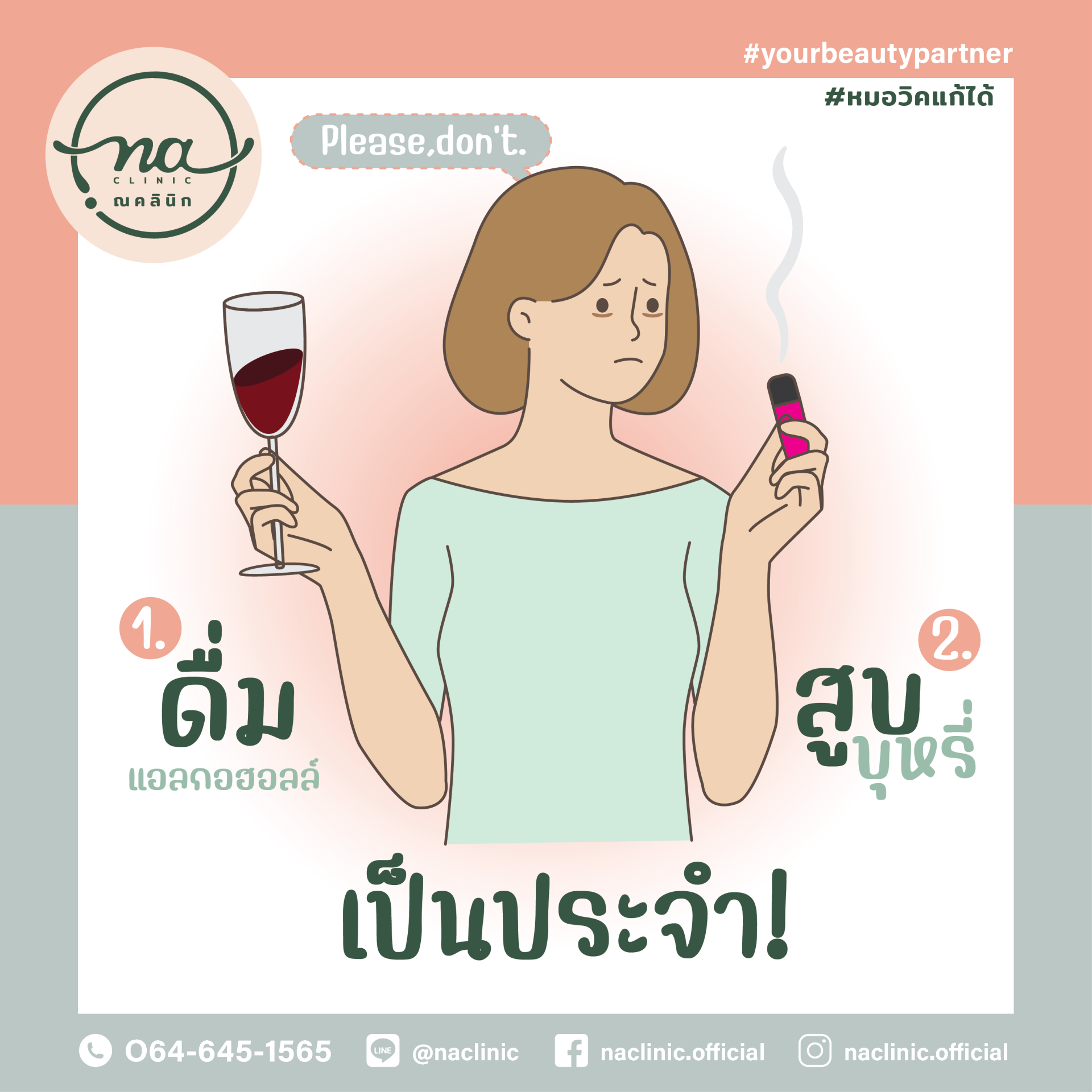 ในบุหรี่และแอลกอฮอลล์มีสารเคมี และอนุมูลอิสระที่ ทำลายคอลลาเจนและอีลาสตินในชั้นผิว