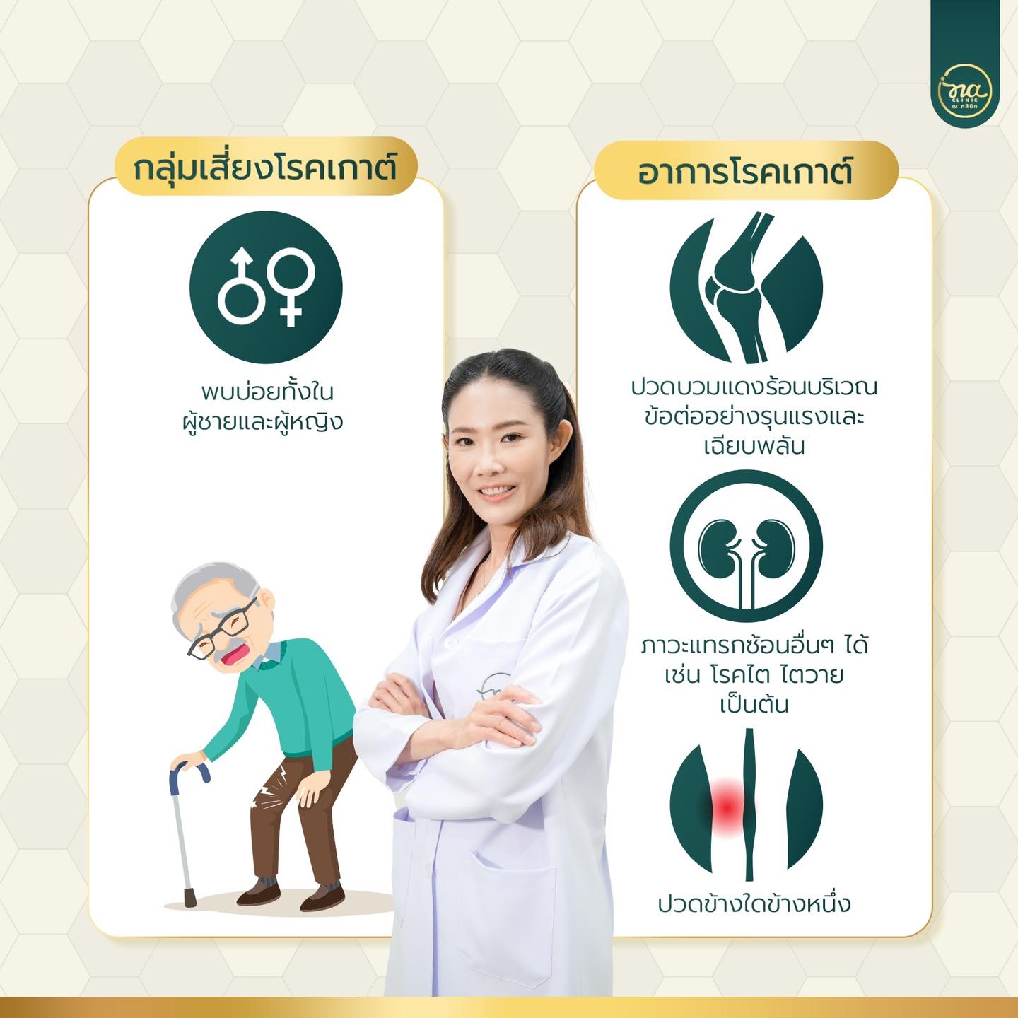 คงจะมีหลายคนเคยสงสัยเหมือนพี่หมอใช่มั้ยว่า #โรคเกาต์ และ #ข้อเข่าเสื่อม ใช่โรคเดียวกันหรือไม่ แล้วจะรู้ได้อย่างไรว่า อาการที่เราเป็นอยู่นั้นเกิดจากโรคไหนกันแน่