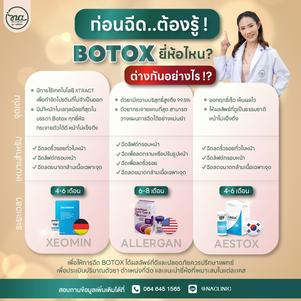 ปัจจุบันโบท็อกมีหลากหลายยี่ห้อ จากหลายประเทศ ก่อนจะตัดสินใจฉีดโบท็อกซ์ ควรศึกษาข้อมูลอย่างละเอียดทั้งข้อดี-ข้อเสีย ข้อจำกัดการฉีดว่า สามารถฉีดจุดไหนได้บ้าง ? หลังฉีดกี่วันจะเห็นผล ? กันก่อนนะคะ