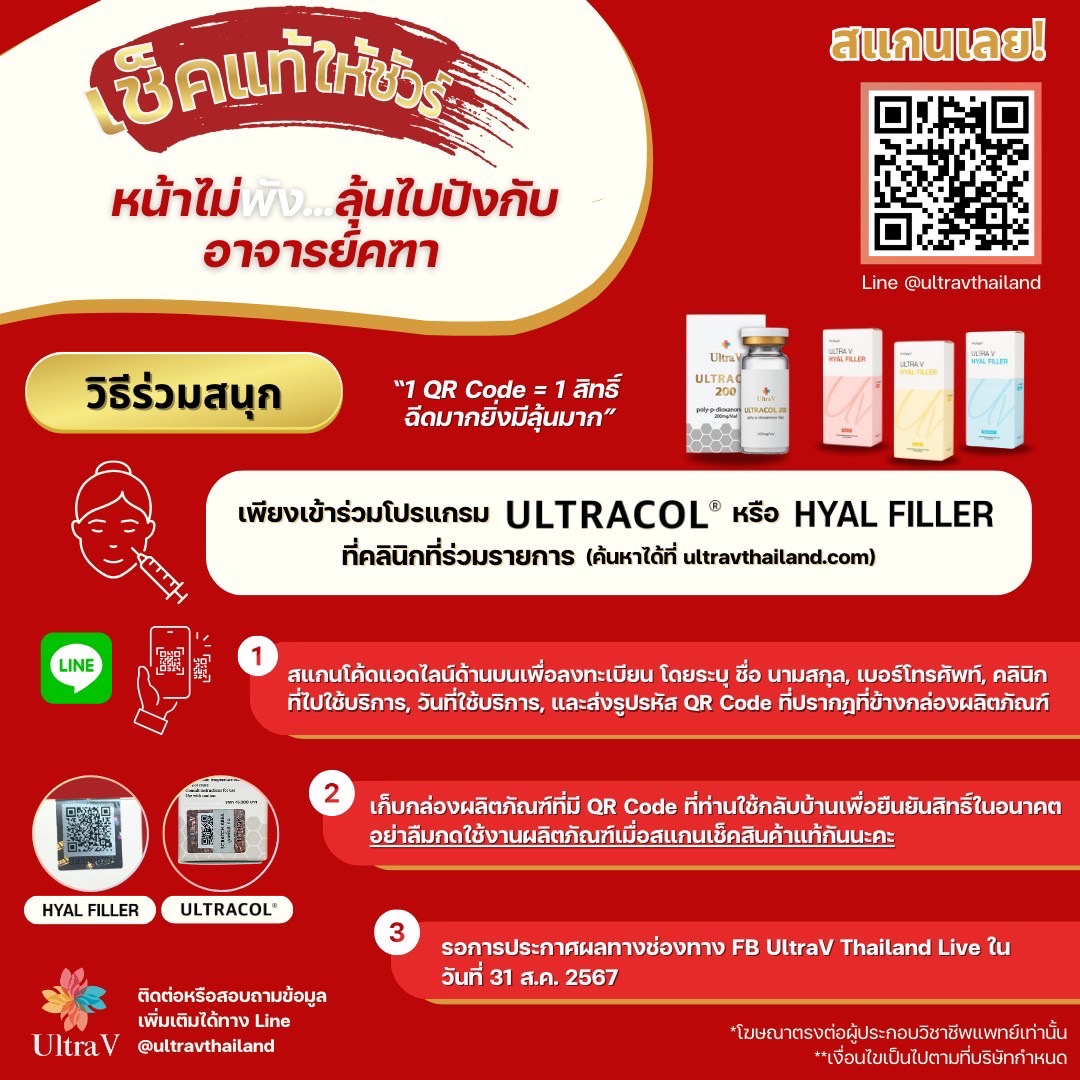 พร้อมร่วม Campaign "เช็คแท้ให้ชัวร์ หน้าไม่พังลุ้นไปปังกับอ.คฑา ชินบัญชร" ที่ประเทศฮ่องกงเพียงแค่ร่วมโปรแกรมฉีด UltraV HYAL FILLER หรือ UltraV ULTRACOL® ที่ ณ คลีนิคนะคะ